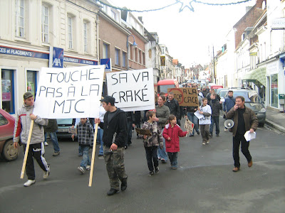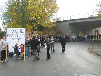 Il est 10 h 45, devant la MJC. Une petite foule s’est formée. La banderole qui orne l’entrée du bâtiment est toujours là. Slogans, itinéraire, le directeur Bernard Desbois règle les derniers détails, pendant que d’autres rassemblent les pancartes. Plus de vingt minutes plus tard et avec un peu de retard sur l’horaire prévu, le cortège se met en branle pour le défilé, compacté sur la voie de droite de la chaussée. En tête, une douzaine de jeunes brandissent des pancartes « Stop à la cace », « Sa va craké ». Et en tête, le mot d’ordre de la mobilisation depuis le début : « Touche pas à la MJC ». Armé d’un mégaphone, Bernard Desbois lance les slogans, repris avec force par les jeunes mais qui peinent à trouver écho dans le reste du cortège, étiré et donc un peu clairsemé. « Saint-Pol avec nous ! », s’égosillent trois jeunes filles au premier rang. Le directeur de la MJC est enthousiaste : « On est nombreux, le 8 novembre va faire date à Saint-Pol ».